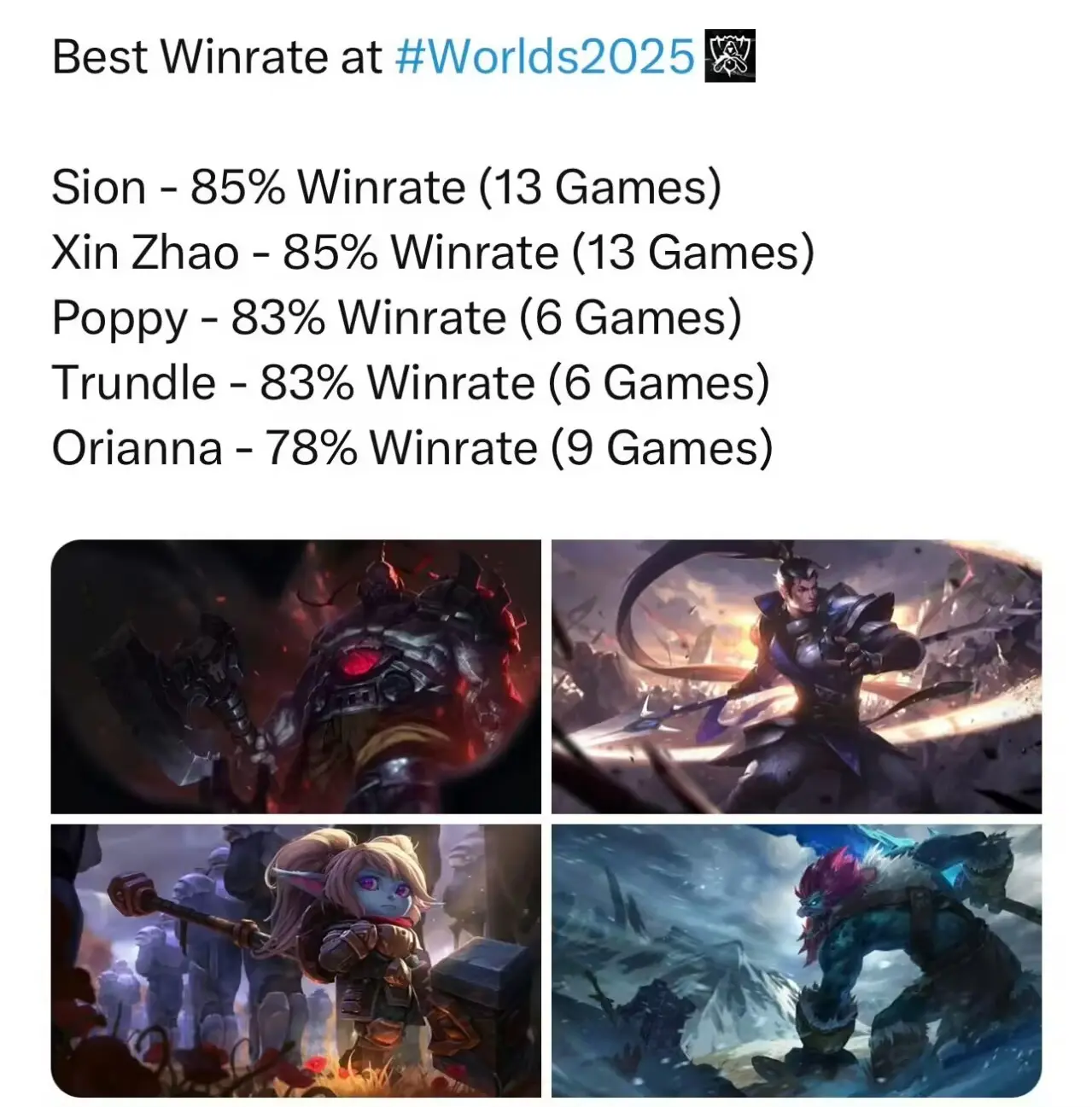 随着瑞士轮BO1比赛全部结束,拳头官方也是公布本届S15世界赛的最高胜率英雄(登场率超过五场),其中上单赛恩、打野赵信、辅助波比或者上单波比、打野巨魔以及中单发条是当前版本胜率最高的前五英雄。而打野皇子、上单奎桑提、中单瑞兹、下路卡莎则是当前世界赛版本胜率垫底的英雄。(你们觉得世界赛版本当中,哪位英雄是真正的“版本答案”呢?)
